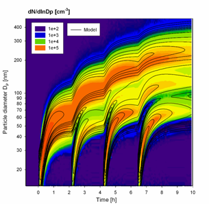 Die Bildung von neuen Aerosolpartikeln und deren Wachstum zu Kondensationskeimen bilden bislang noch eine der wesentlichen Unsicherheiten für die Quantifizierung des Einflusses von Aerosolpartikeln auf das Klima der Erde. Neben Sulfat- und z.T. auch Nitratpartikeln tragen vor allem organische Partikel, die vorwiegend aus biogenen Quellen stammen, zur Entstehung und zum Wachstum neuer Aerosolpartikel bei. Um diese Prozesse in den globalen Transportmodellen korrekt abbilden zu können werden sie gezielt in Simulationskammerexperimenten untersucht. In der AIDA Simulationskammer des IMK-AAF können insbesondere die Temperaturabhängigkeiten bei realitätsnahen Konzentrationen untersucht werden. Aus gemessenen Partikelanzahlkonzentrationen und Größenverteilungen können dabei Partikelbildungs- und Partikelwachstumsraten abgeleitet werden. Ziel der Materarbeit ist dies für die Bildung von Partikeln aus der Oxidation der in der Atmosphäre besonders häufigen Terpene, Pinen und Limonen, zu tun.