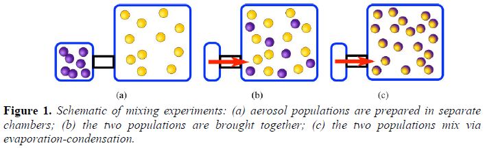 Schematische Darstellung eines Kammerexperiments mit zwei Arten von Aerosolpartikeln (von z. Bsp. zwei verschiedenen Quellen), und der Veränderung des Mischungszustandes mit zunehmender Aufenthlatszeit im Reaktor (Quelle: 2014 Progress Report: Sensitivity of Organic Aerosol Concentrations and Forcing to Anthropogenic Emissions, EPA Grant Number: R835405)