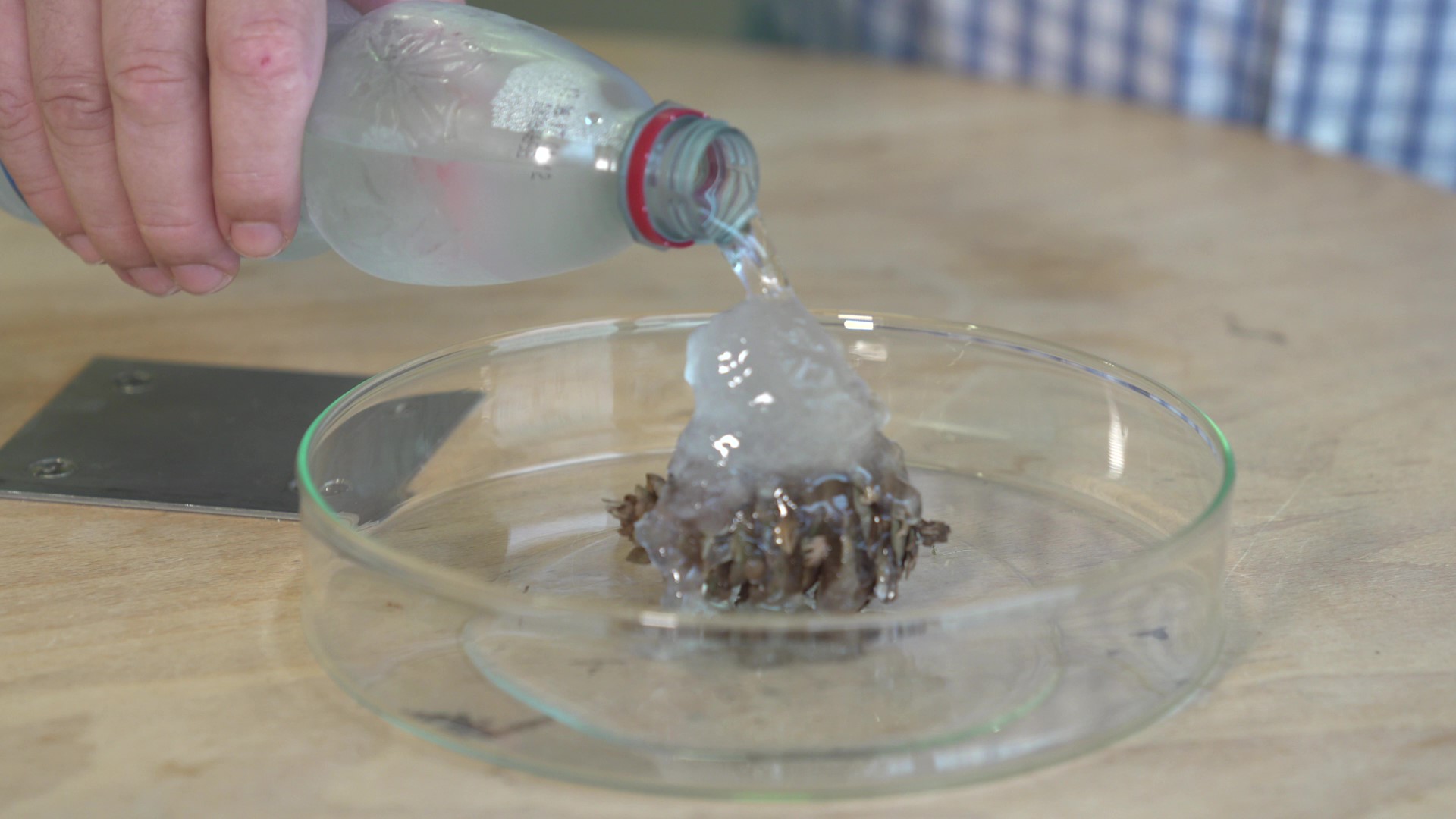 Supercooled water (-8°C) freezes immediately on contact with a cone due to the bacteria on it.